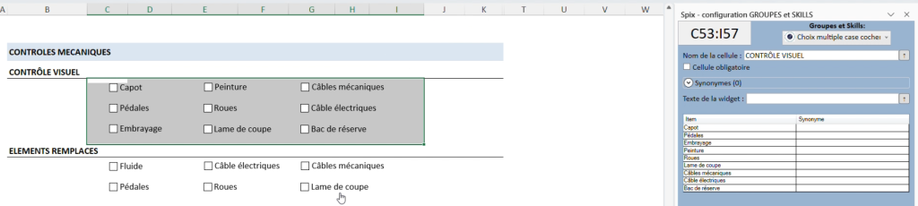 Association d’éléments spécifiques de Excel (par exemple des cases à cocher) à des SKILLS vocaux de SPIX. Sur l’exemple, plusieurs cases à cocher sont associées à un SKILLS “Choix multiple” pour permettre à l’utilisateur de dire “Capot Pédales Roues” pour cocher d’un seul coup les 3 cases.