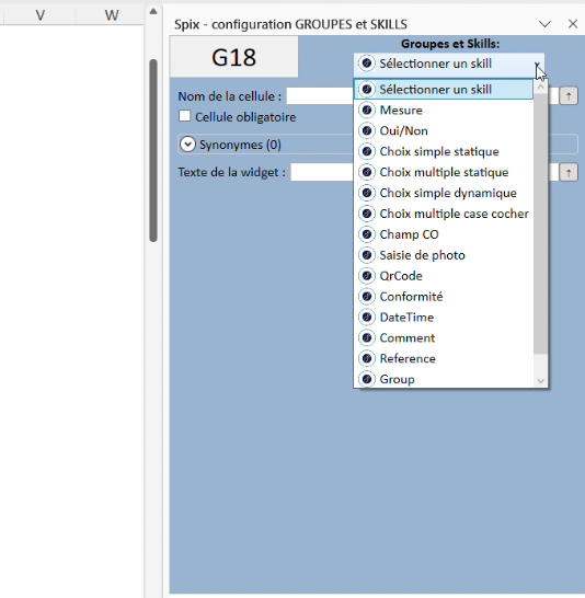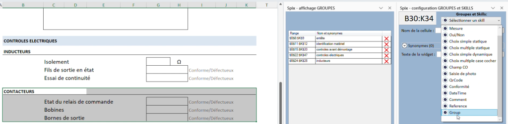 - Exploitation des SKILLS de SPIX pour remplir et manipuler des champs typés dans Excel: choix dans des listes, mesure numérique, référence alphanumérique, texte libre, date et heure, case à cocher, photo, …